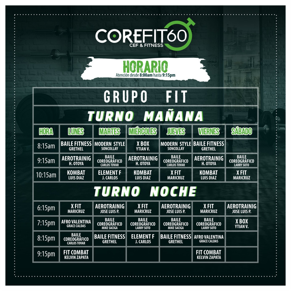 En Corefit 60 se ofrecen actividades como Abdominales, Acondicionamiento Físico, Fit combat, Gimnasia Localizada, Hip Hop, Ritmos latinos, Ritmos urbanos y Musculación.